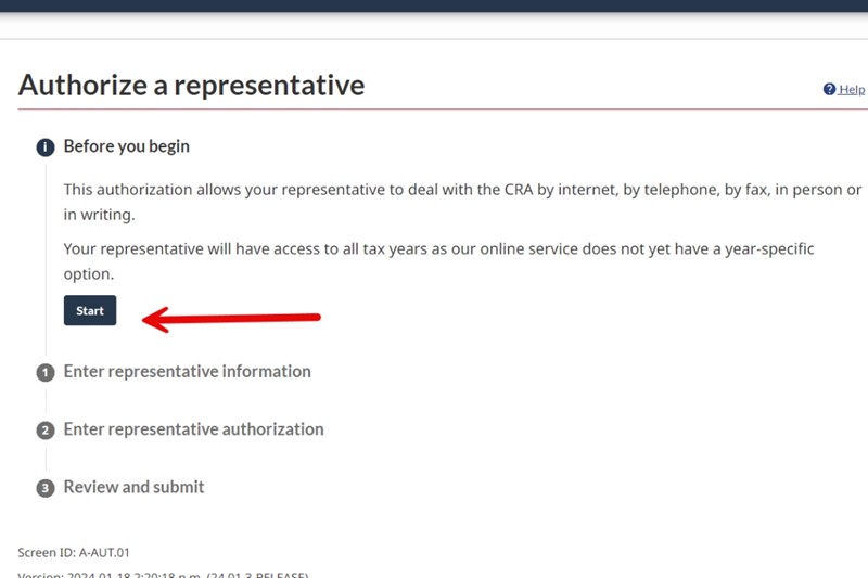 Read the information provided by CRA and click on the Start button to authorize a representative.